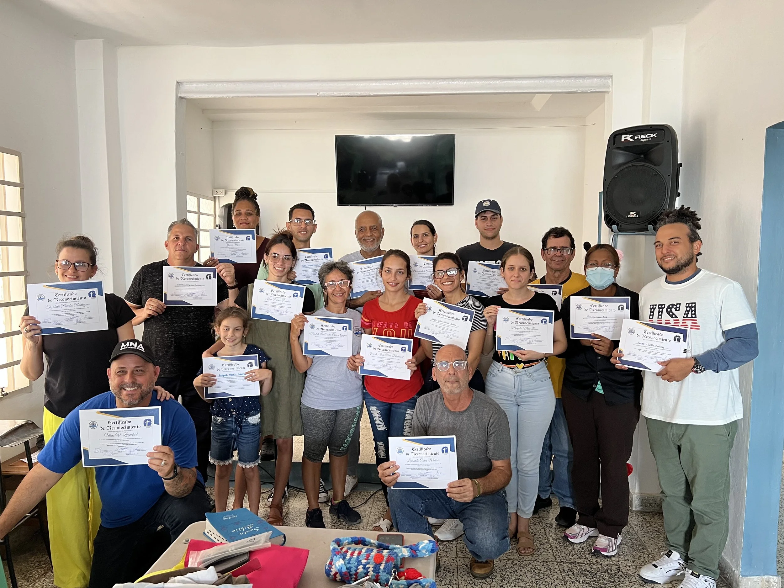 Estudiantes de seminario y maestras de escuela dominical con niños y jóvenes.